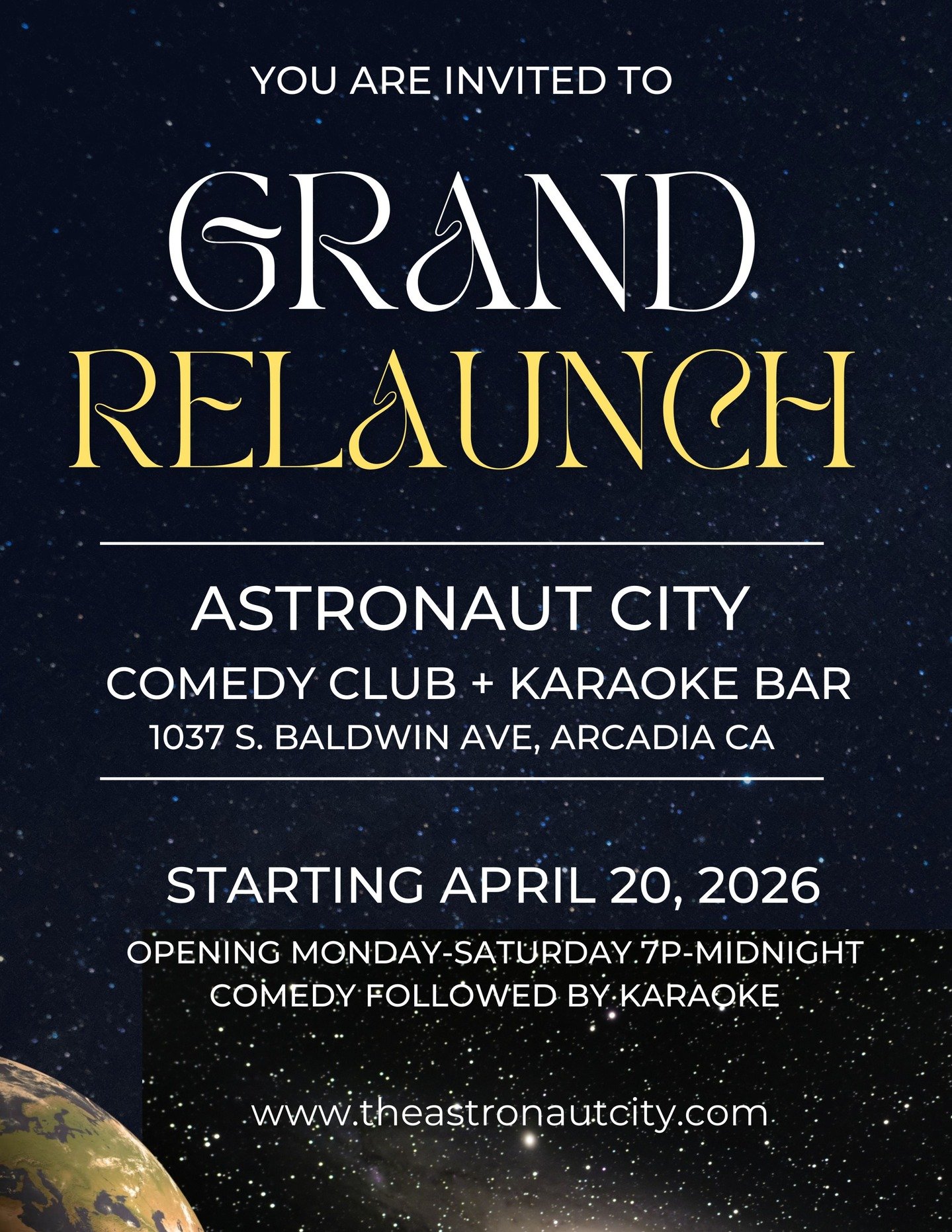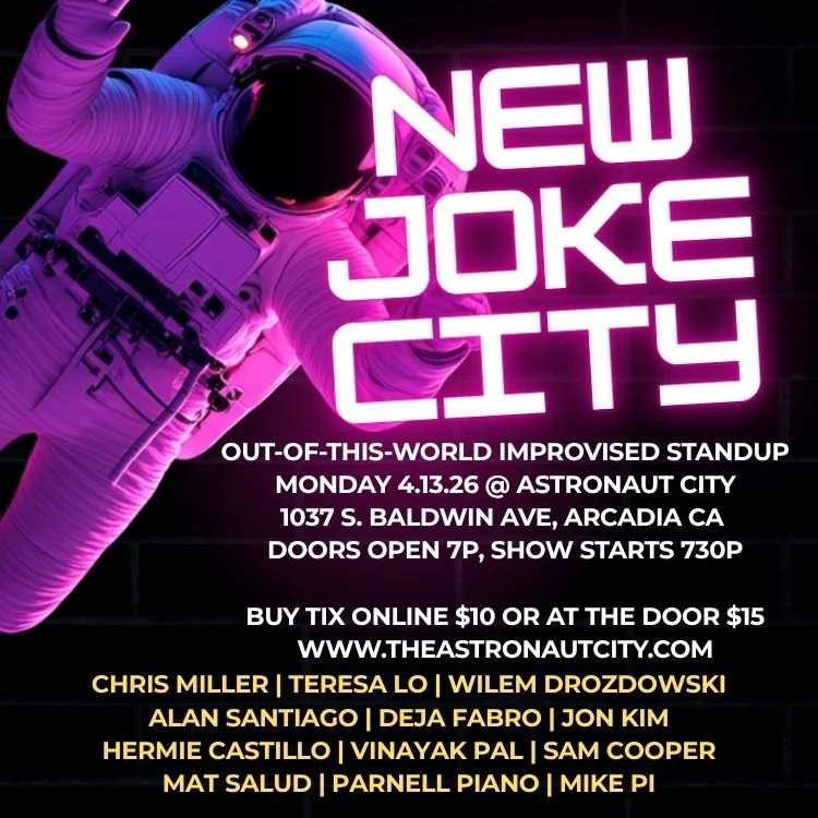 New Joke City is Astronaut City’s signature improvised stand-up comedy show, created by Teresa Lo. Booked comedians take the stage with no prepared material and riff entirely from audience suggestions, making every show completely different. Expect interactive crowd work, playful heckling, TMI overshares, raunchy confessions, and spontaneous punchlines built in real time. Perfect for guests looking for live comedy in Arcadia, near Pasadena, or other parts of the San Gabriel Valley, New Joke City delivers a high-energy, anything-can-happen experience where the audience becomes part of the show.