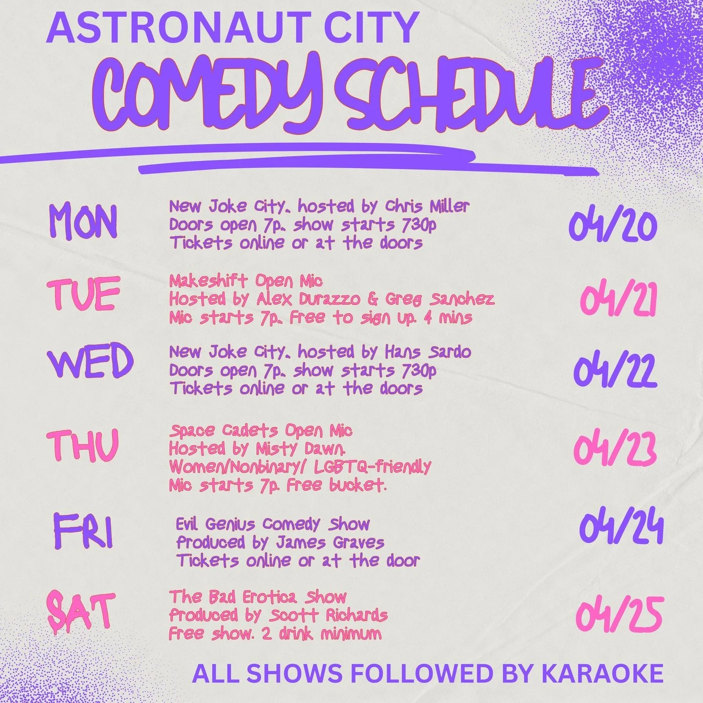BOOKED SHOWS: Astronaut City has booked shows, including its signature house show, New Joke City; and our popular independently produced shows Evil Genius Comedy, Karaoke Comedy Allstars, and The Bad Erotica Show. New Joke City is currently not open for submissions, but if you are interested in our independent shows, please contact those producers directly.