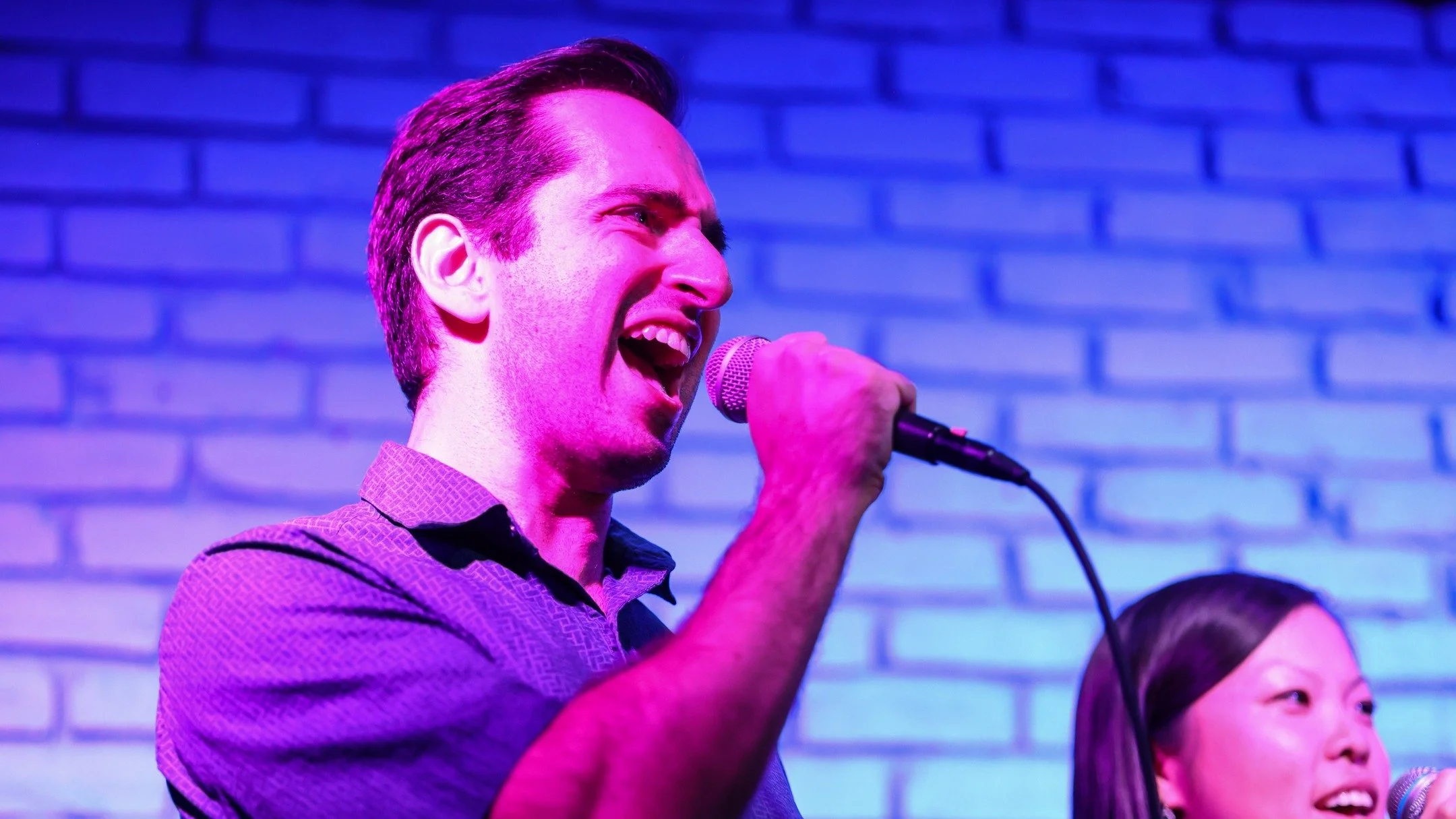 Our intimate stage has a TV, multiple mics, and stage lighting